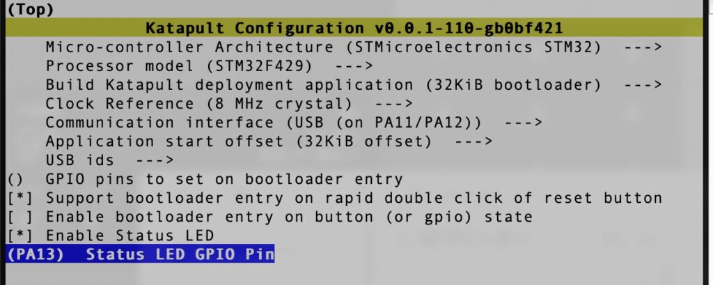 一番下のEnable Status LEDにカーソルを合わせスペースを押すとチェックが付きGPIO Pinを指定できます、ココでLEDを指定しておくとDFUモードに入った時にLEDが点滅したりしてモードの確認が簡単になります、なりますがKatapultを入れておけばDFUモードにするのはKatapultを焼きなおす時くらいなのであんまり意味がないかもしれません。